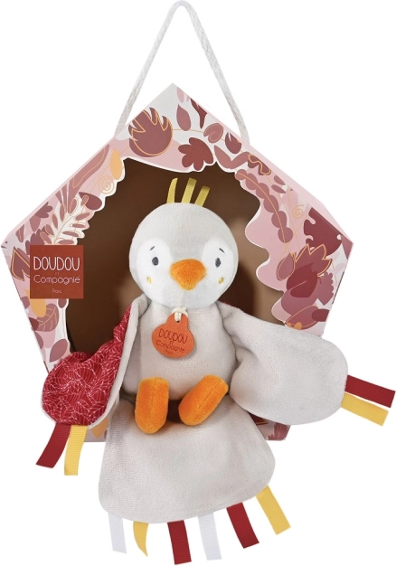 Zenélő plüss madárka a Doudou ajándékszettből, amely lágy dallamaival és puha plüss anyagával már újszülött kortól megnyugtatja a babákat. A színes szalagok a finommotorika fejlesztéséhez felfedezésre és rágcsálásra csábítanak, miközben a bájos madárka egy egyedi, madárodú alakú ajándékdobozban kap helyet. A CE szabványoknak megfelelő biztonságos kivitel és a könnyű tisztítás ideális ajándékká teszi újszülöttek számára.