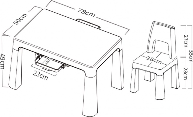 Az asztal mérete 78 x 50 x 49,54 cm, a székek mérete pedig 28 x 28 x 55 cm, ami ideális méret a 3-9 éves gyerekek számára.