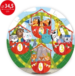 Ez a gyönyörű, kerek kirakó az óriáskeréken utazó állatok témájával játékos tanulást nyújt a gyerekeknek. Az áttekinthető darabszám és a barátságos dizájn miatt kiváló az első kirakási sikerekhez és a közös pillanatokhoz a szülőkkel.