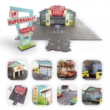 A szupermarket burger étteremmel, parkolóval és útjelzésekkel élethű jelenetet teremt, amely bevonja a gyerekeket a játékba és fejleszti a képzelőerejüket.