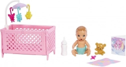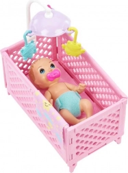 A Barbie Skipper Dadus szettet a filmes világ ihlette, és úgy tervezték, hogy örömet szerezzen a gyerekeknek az őrzés-gondozás szerepjátékában. Ha a babának cumit vagy cumisüveget adsz, a szemei lecsukódnak – eltávolítás után újra kinyílnak. A forgós kiságy és a további kiegészítők nyugodt altatási környezetet teremtenek.