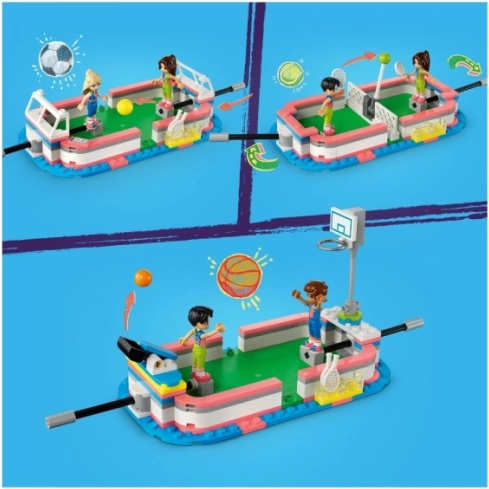 A LEGO Friends sportközpont végtelen játékélményt nyújt. A moduláris pálya könnyen átváltható fociról teniszre vagy kosárlabdára, nem hiányzik az eredményjelző, a biztonságos labdatároló és a részletes háttér sem – edzőterem, mászófal és öltöző. A LEGO Builder alkalmazással az építés intuitív a nagyításnak, a modell forgatásának és az előrehaladás követésének köszönhetően.