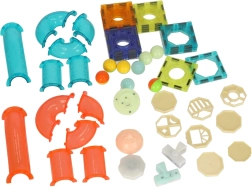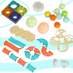 A készlet sokoldalú építést kínál 2D-ben és 3D-ben: az egyszerű formáktól a komplex pályákig. A mágneses négyzetek stabilitást biztosítanak, míg a csövek és alagutak könnyen „rákattinthatók”. A világító elemeknek és golyóknak köszönhetően minden lejtmenet szórakoztató, vizuálisan lenyűgöző élmény.