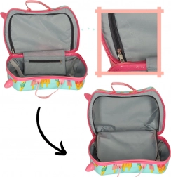 A speciális kialakítás lehetővé teszi, hogy a gyermek a bőröndön üljön vagy röviden guruljon rajta. A beépített lábtámaszok és kézfogók kényelmesebb és biztonságosabb tartást biztosítanak.