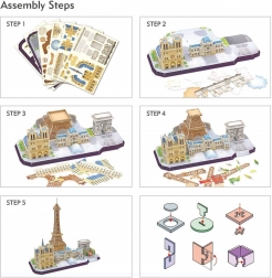 A 3D Puzzle City Line Párizs izgalmas szórakozás gyerekeknek és felnőtteknek egyaránt. A csomag 114 darab kirakódarabot tartalmaz, amelyek egy speciális, habszerű anyagból készültek. A darabok számozottak, kivágottak és ívekre vannak elhelyezve. A darabokat egyszerűen, erőkifejtés nélkül kinyomhatja az ívekből, és az mellékelt útmutató szerint összeállíthatja, ragasztó vagy speciális eszközök használata nélkül.