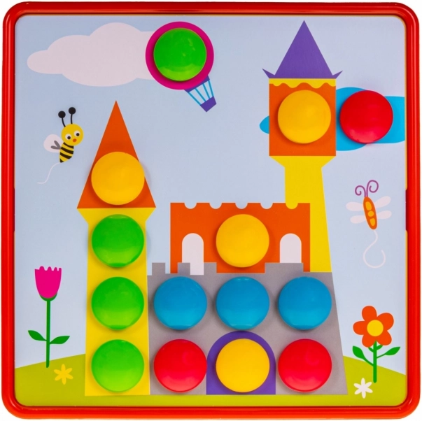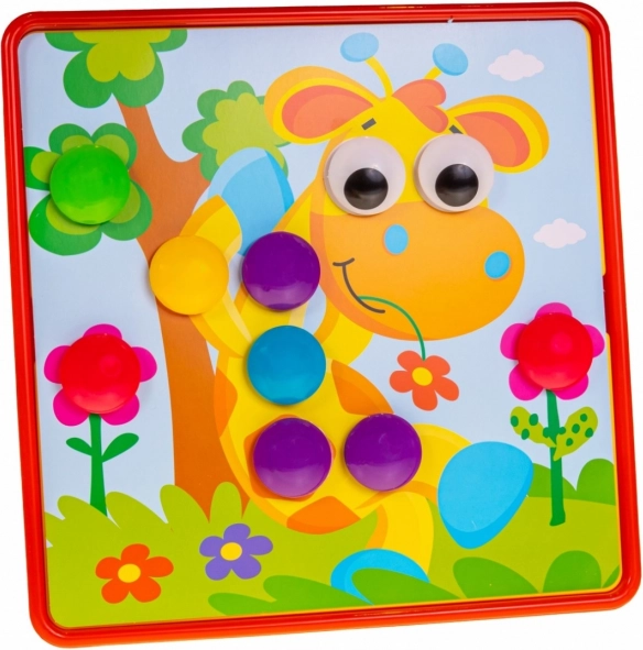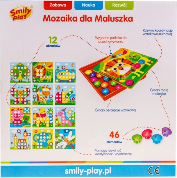 Ez a színes gyerekmozaik egyszerű elvet kínál, amit a gyerekek azonnal megértenek: válassz a 12 sablon közül, kövesd a színes körvonalakat, és helyezd a pötyiket a megfelelő lyukakba. A feltűnő színeknek és a nagy elemeknek köszönhetően az összerakás szórakoztató és intuitív még a legkisebbek számára is.