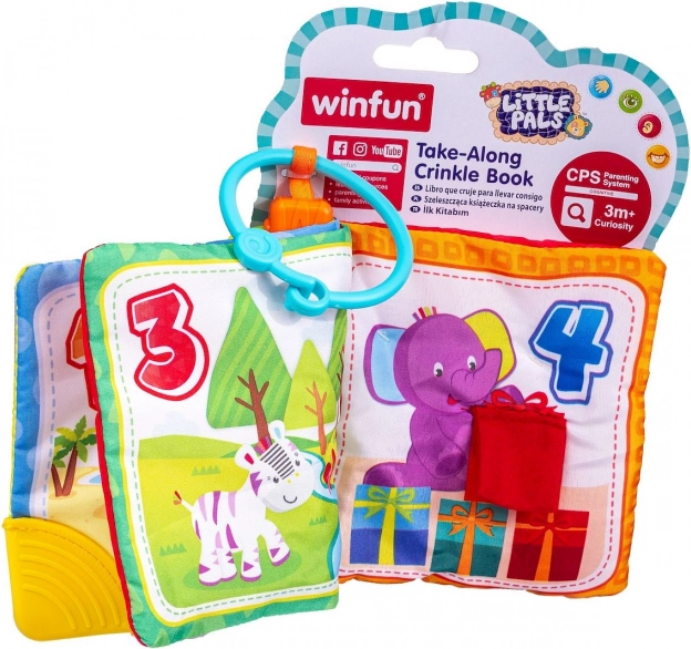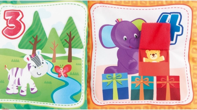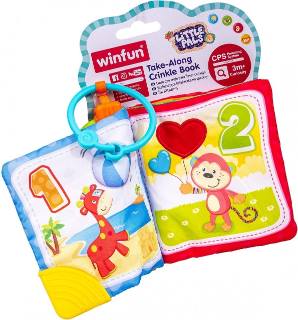 A könyvecske a játékot és a tanulást ötvözi – a vidám illusztrációk, a rejtett meglepetések és a forgatható gyöngyök stimulálják a látást, a hallást és a tapintást. A fogzó babák értékelni fogják a puha rágókát, amely megkönnyebbülést nyújt az ínynek.