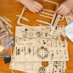 Fedezze fel a mechanika varázsát a ROKR Explorer fa golyópályával – egy okos 3D puzzle, amely ötvözi a STEM oktatást, a precíz lézervágást és a kézi hajtást kurblival. Építse össze a modellt, tekerjen egyet, és figyelje, ahogy az acélgolyók száguldanak a darus felvonón, a döntött kanyarokon és a váltómechanizmuson két különböző útvonalra.