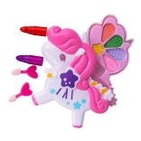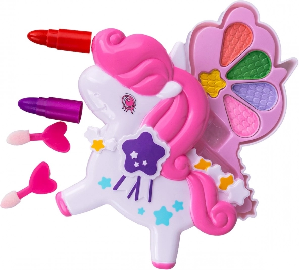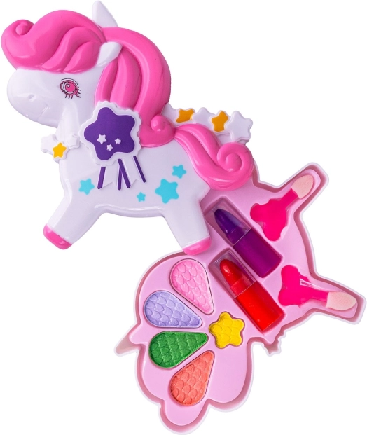 Ez a bájos, unikornis alakú sminkkészlet ideális az első lépésekhez a sminkelés világában. A gyerekek biztonságos és szórakoztató játékot élvezhetnek, amely fejleszti a képzelőerőt és a finommotorikát. A kihajtható szárnyak élénk szemhéjpúder palettát rejtenek, és rúzs is található benne az ajkak színezéséhez.