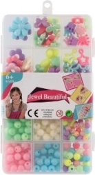 A készlet különböző formájú és méretű gyöngyöket tartalmaz ragyogó színekben, melyek inspirálnak egyedi karkötők és nyakláncok készítésére.