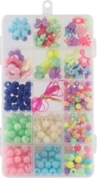 Fedezd fel az alkotás örömét ezzel a komplett gyöngykészlettel, amely remek választás kezdőknek és kisebb alkotóknak is. A dobozban színek és formák gazdag választékát találod – a golyócskáktól a virágokig –, és a mellékelt zsinórnak köszönhetően azonnal elkezdheted egyedi karkötők és nyakláncok készítését. Az átlátszó, rekeszes rendező biztosítja, hogy a gyöngyök szétválogatva és mindig kéznél legyenek.