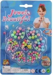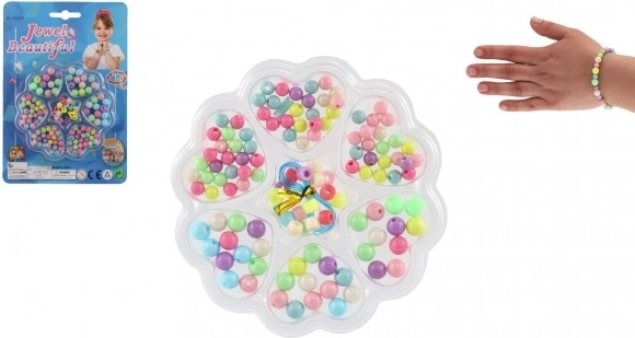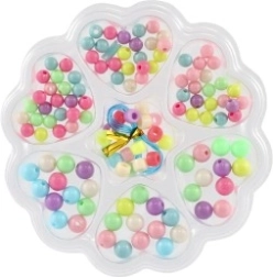A készlet különböző színű és méretű műanyag gyöngyöket tartalmaz.
