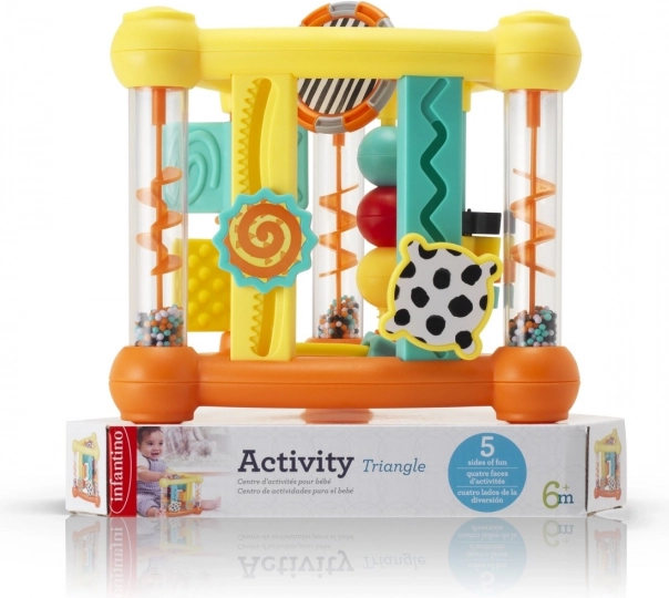 Háromszög alakú aktív játék központ számos elemmel: különféle formák, gyöngyök, gombok. Beltéri és kültéri játékra egyaránt alkalmas. A játék háromszög alakja lehetővé teszi, hogy könnyen magaddal vidd és hordozd. Minden oldala más-más szórakozást kínál.