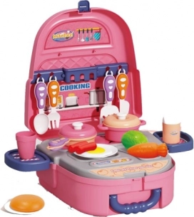Praktikus csomagolású konyhai szett, könnyen összepakolható és hátizsákként viselhető. A szett 22 darab konyhai kiegészítőt tartalmaz: evőeszközöket, lábasokat, fedőket, ételutánzatokat és egyéb tartozékokat. Támogatja a test és az agy összehangolt fejlődését, segít a gyermeknek játék közben megtanulni a szem, a kéz és az agy koordinációját.