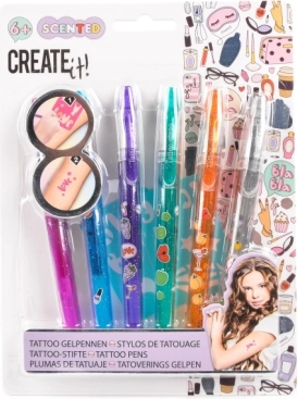 Legyen kreatív ezzel a csodálatos CREATE it! tetováló készlettel. A készlet hat színes illatos tollat tartalmaz rózsaszín, kék, lila, zöld, narancssárga és ezüst árnyalatokban, ami lehetővé teszi végtelen számú terv létrehozását. Minden toll dekoratív dizájnnal és illatos esszenciával van ellátva a még szórakoztatóbb élmény érdekében.