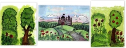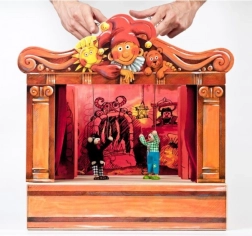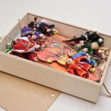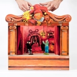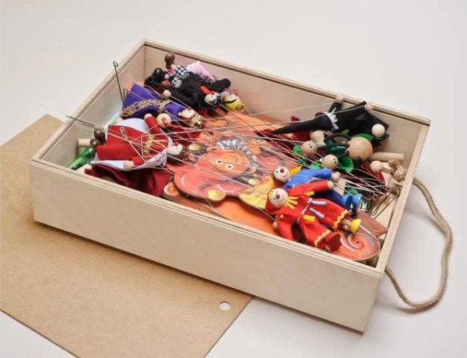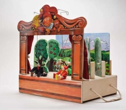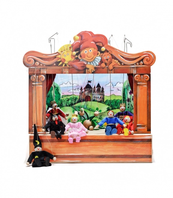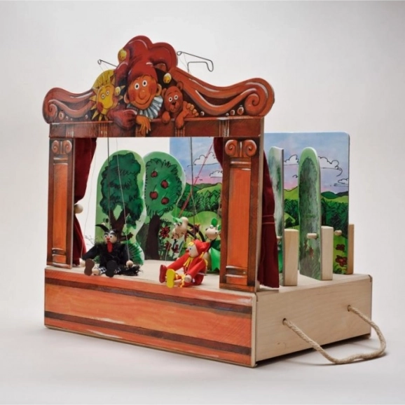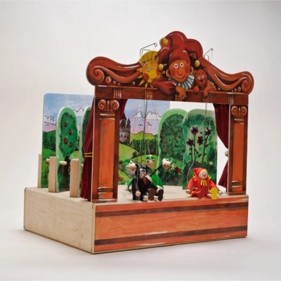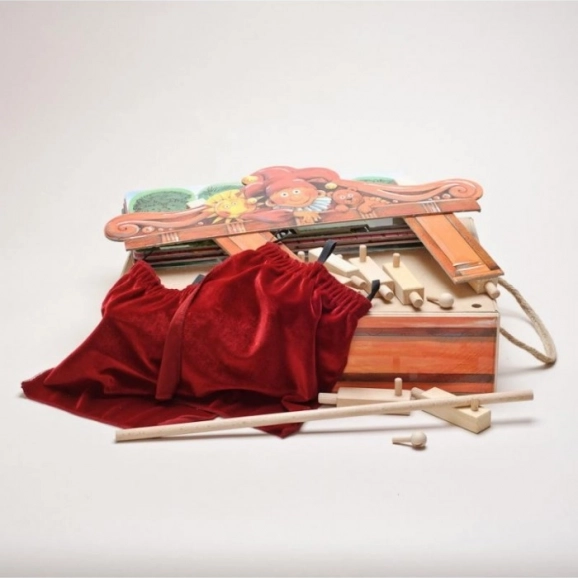 Fából készült színház 2 kétoldalas díszlettel és 8 bábbal. Kézzel készített bábok, bővíthető további bábokkal és díszletekkel.