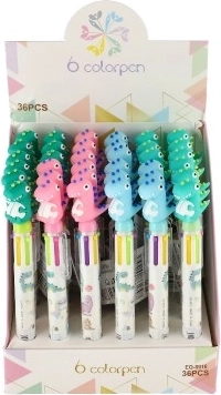 Ez a praktikus, 6 az 1-ben toll aranyos dinoszauruszos topperrel ötvözi a funkcionalitást és a szórakozást. A hat tintaszínnek köszönhetően mindig kéznél van a megfelelő árnyalat jegyzeteléshez, aláhúzáshoz vagy alkotáshoz. A színek közti váltást különálló csúszkák biztosítják a toll testén.