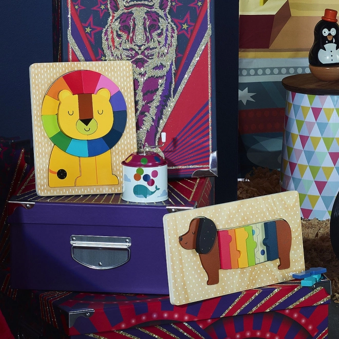 A népszerű beillesztős puzzle kutyussal nemcsak a szenzomotoros képességek fejlődését segíti, hanem a színek és formák felismerését is. A robusztus fa darabok ideálisak a kicsi gyerekkéz számára, így könnyedén összeállíthatják saját kutyus barátjukat.