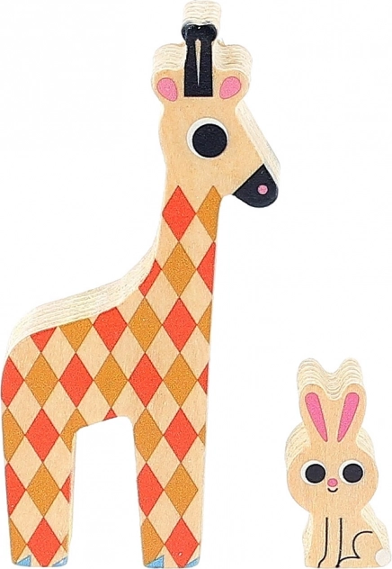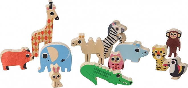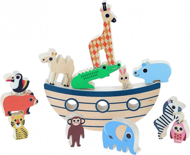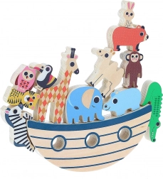 A játék 12 fa állatot tartalmaz, amelyeket a gyerekek egymásra helyezhetnek és kiegyensúlyozhatnak az alapzaton.