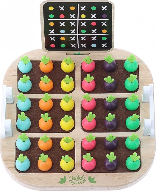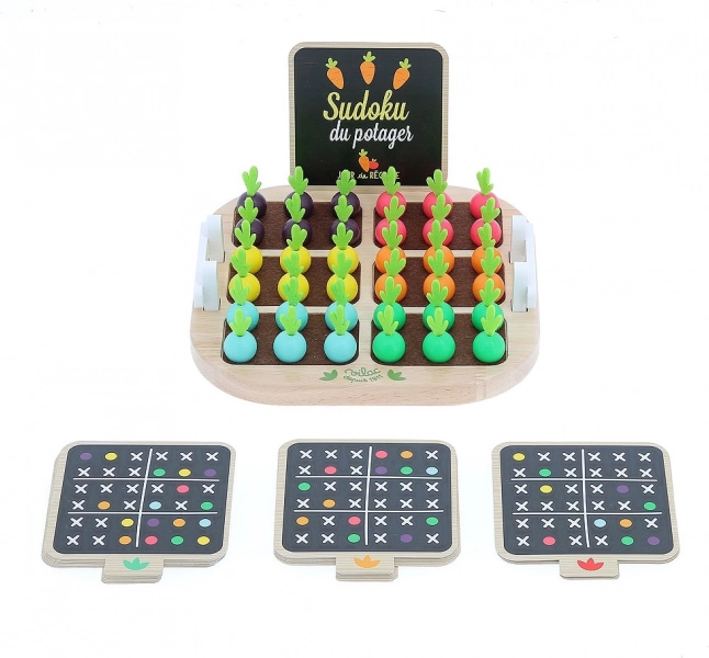 Itt egy egyedi lehetőség, hogy a gyerekeket szórakoztassuk és egyben fejlesszük kognitív képességeiket. A Zöldség Sudoku kiváló minőségű fából készült, mely biztosítja stabilitását és tartósságát. A színes fa zöldségdarabokkal a gyerekek megpróbálják kitölteni a rácsot a mellékelt kártyák szerint úgy, hogy se azonos sorban, oszlopban, se blokkban ne ismétlődjenek a színek.