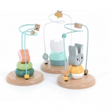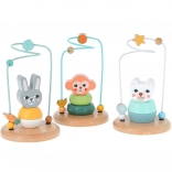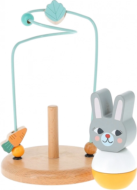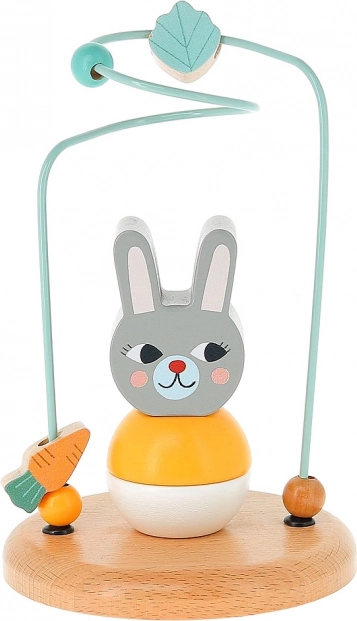 Ez a fa labirintus fém pályával és nyuszifigurával szórakoztató tevékenységet kínál: a gyerekek gyöngyöket és formákat (répa, levél) tologatnak a hullámos útvonalon. A játék támogatja a finommotorika, a koncentráció és a türelem fejlődését, miközben masszív fa talpának köszönhetően biztonságos és stabil.
