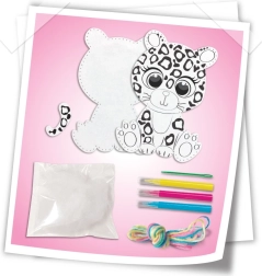 Ezzel a kreatív készlettel a gyerekek saját aranyos párducukat készíthetik el – az előre kivágott filc elemek összevarrásától a kész játék kiszínezéséig. A műanyag tűnek és az előre kilyukasztott nyílásoknak köszönhetően a varrás könnyű és biztonságos még kezdők számára is. A színes filctollak egyedi megjelenést tesznek lehetővé.