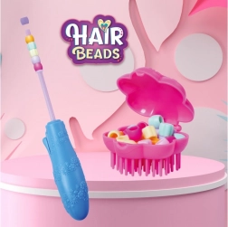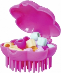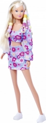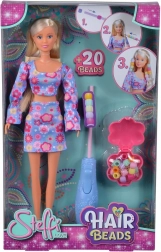 Steffi baba virágmintás, két részes öltözékben, hajtincsre fűzhető gyöngyökhöz való horgonnyal, színes gyöngyökkel, rögzítő gumival és tárolórekesszel ellátott fésűvel. A baba magassága 29 cm.