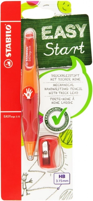 A STABILO EASYergo kifejezetten a jobbkezes gyerekek kezéhez lett tervezve. Az ergonomikus forma és a csúszásmentes fogórész segít a helyes íróeszköz-tartás elsajátításában, így a gyerekek gördülékenyebb, olvashatóbb írást érhetnek el felesleges fáradtság nélkül. A vastagabb, 3,15 mm átmérőjű HB grafit ellenálló a töréssel szemben, és lágy, folytonos vonalvezetést biztosít.