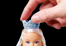 A korona elfordításával a gyerekek maguk választhatnak megjelenést: a romantikus rózsaszín virágos ruhából egy szempillantás alatt elegáns fehér menyasszonyi ruha lesz.