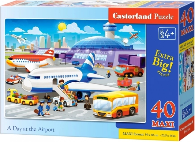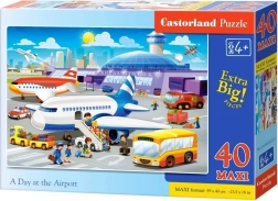 Színes maxi puzzle gyerekeknek NAP A REPÜLŐTÉREN témával: 40 nagy darab a könnyű kirakáshoz, kirakva mérete 59 × 40 cm. A Castorland minőségi kivitelezése fejleszti a finommotorikát, a koncentrációt és a képzelőerőt. Ajánlott 4 éves kortól.