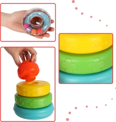 Ez a stabil és biztonságos szensoros torony játékosan hozza el az első tanulási élményeket. A különböző méretű, színű és textúrájú gyűrűk fejlesztik a finommotorikát, a kéz–szem koordinációt és a színek megkülönböztetését. Az egyik gyűrű felső, átlátszó része csörgő gyöngyöket rejt, ami a hallást is stimulálja.