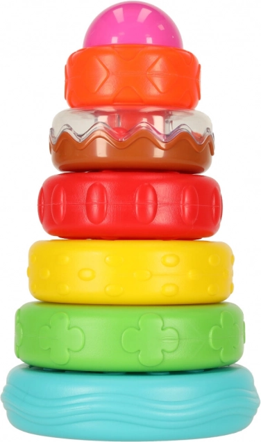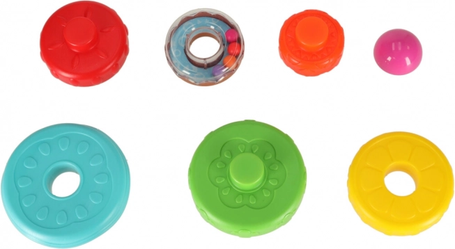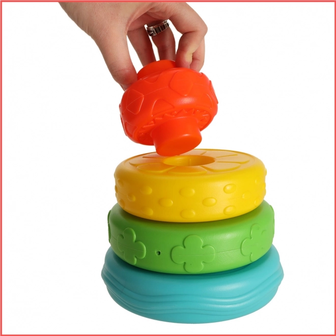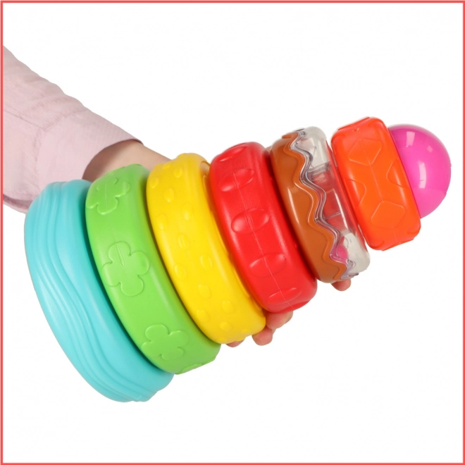 A torony építése és a gyűrűk felhelyezése erősíti az ujjak finommotorikáját és a kéz–szem koordinációt.