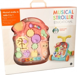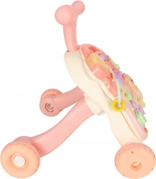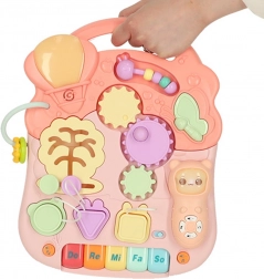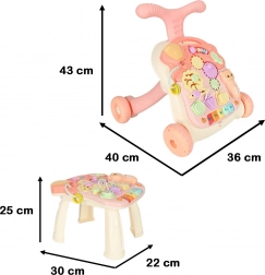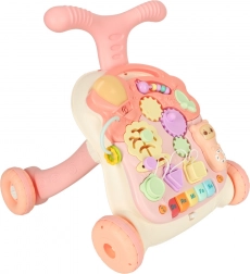 Ez a multifunkciós 3 az 1-ben játék alkalmazkodik a gyermek fejlődéséhez: először interaktív, függeszthető panelként szolgál a nyugodt játékhoz, majd tevékenységasztalként a kíváncsi álldogáláshoz, végül pedig járássegítőként a biztonságos első lépésekhez. A pasztell rózsaszín színvilág és a színes elemek felfedezésre hívnak, a gombok dallamokat és hangokat játszanak, a változatos tevékenységek pedig fejlesztik a gyermek készségeit.