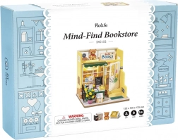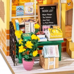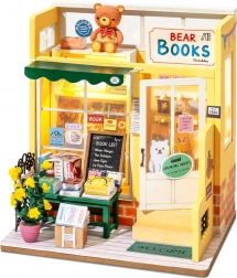 Könyves polcok, bájos mackó, virágok és kiegészítők – minden részlet hozzájárul a miniatűr könyvesbolt valósághű és varázslatos megjelenéséhez.