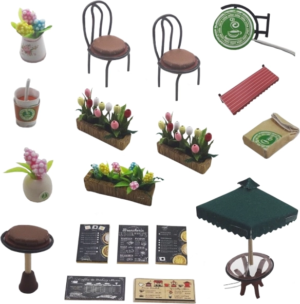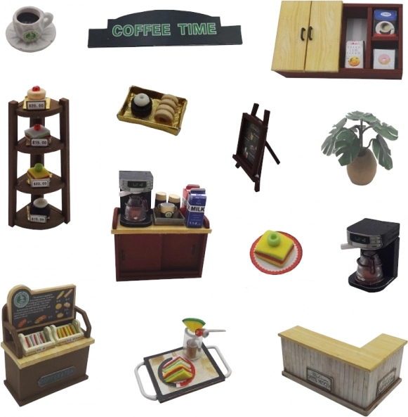 A kávéfőzőtől és a süteményes vitrinől kezdve a tálcákon, italokon és dekorációkon át – minden részlet növeli a modell hitelességét.