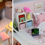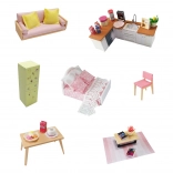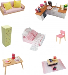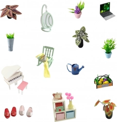A berendezés része apró bútorok, amelyek valóságos megjelenést kölcsönöznek a házikónak.