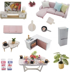 Nappali sarok, étkező, konyha és hálószoba miniatűr bútorokkal és dekorációkkal, amelyek hiteles és lenyűgöző egységet alkotnak.