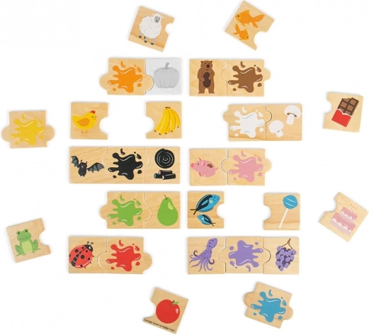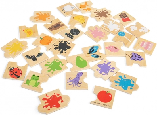 Szórakoztató, fából készült didaktikus kirakó a Bigjigs Toys-tól, amely 30 elem és 10 szín segítségével tanítja a gyerekeket a színek felismerésére. Hármasokat kell összepárosítani (állat, tárgy, szín), fejleszti a kéz–szem koordinációt, a logikus gondolkodást, és bővíti a szókincset. 2 éves kortól ajánlott.