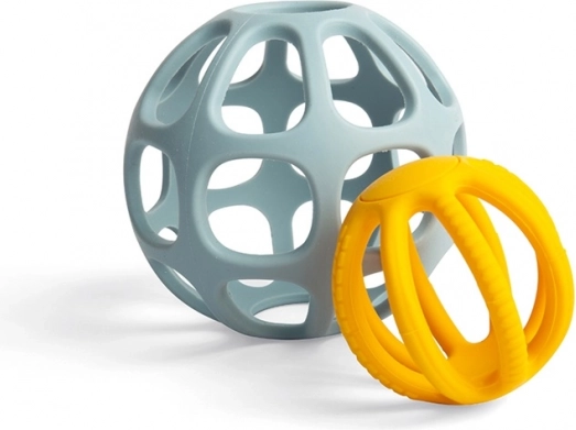 A két darabos szilikon labdakészlet a legkisebbeknek segíti a finommotorika fejlesztését, a fogóerő erősítését, és megkönnyebbülést hoz a fogzás időszakában a rágóka funkciónak köszönhetően. A tartós, nem mérgező anyag könnyen tisztítható és mosogatógépben mosható. A kisebb sárga labda a nagyobba helyezhető, ami logikus gondolkodást serkent és játékosan fejleszti a készségeket.