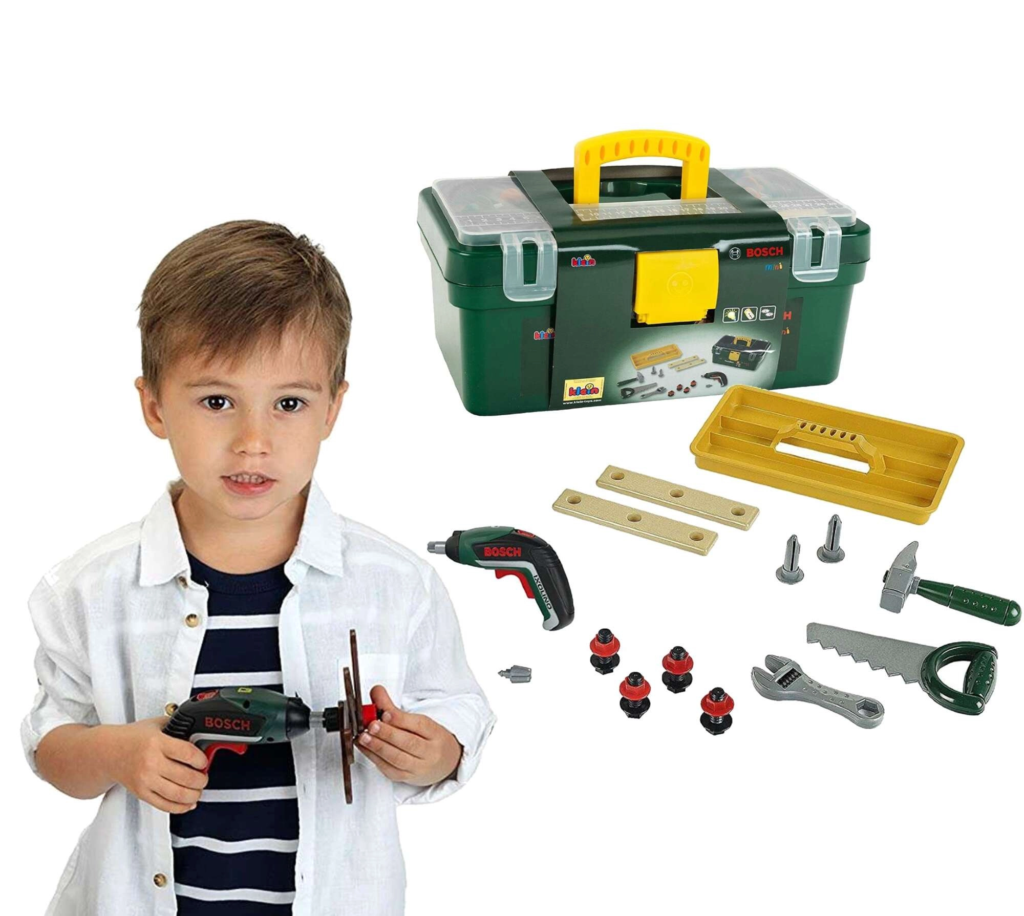 A KLEIN márka BOSCH licencelt dizájnú gyerek szerszámos koffere biztonságos és szórakoztató szerelős játékot kínál. A sötétzöld színű, sárga fogantyúval és átlátszó fedéllel ellátott praktikus koffer gazdag eszközkészletet rejt, többek között vezeték nélküli IXOLINO II fúrógépet bal/jobb forgásirány váltással, fűrészt, kalapácsot, francia kulcsot, csavarokat és építőlapokat. Remek választás a motorika, a kreativitás és a szerepjáték fejlesztéséhez 3 éves kortól.