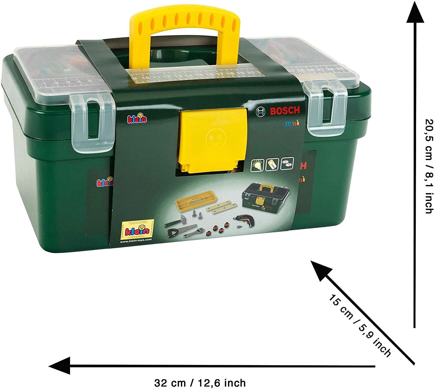 A BOSCH színeiben készült kompakt szerszámos koffer masszív kivitelével, kényelmes sárga fogantyújával és nyitható átlátszó fedelével hívja fel magára a figyelmet, így a gyerekek azonnal látják, mi van benne. Része egy kivehető sárga rekesz fogantyúval az apró alkatrészekhez, hogy semmi ne vesszen el.