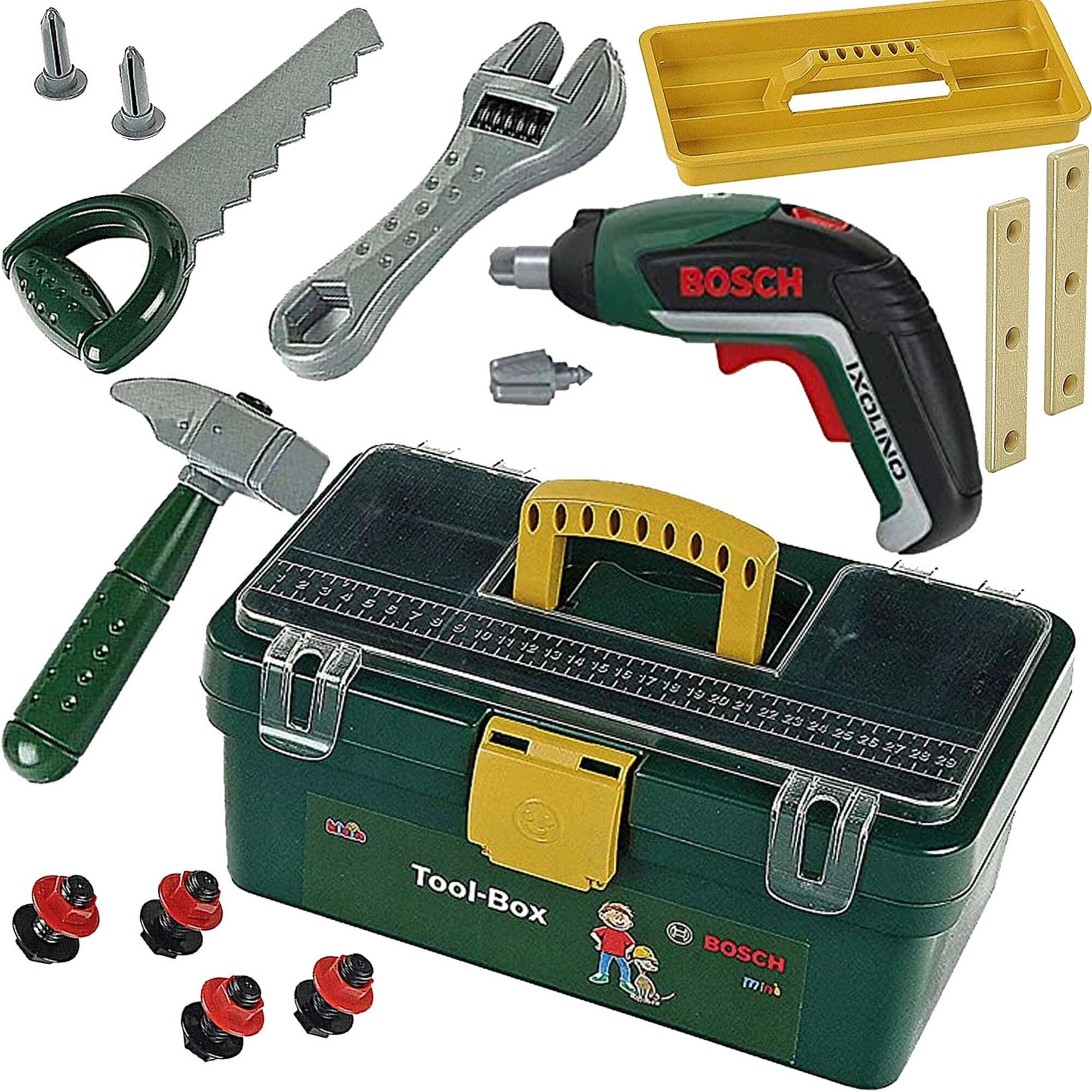 A készlet fő sztárja a gyerek akkumulátoros IXOLINO II fúrógép bal/jobb forgásirány funkcióval és cserélhető bitekkel. Ezt egészítik ki a klasszikus szerszámok – fűrész, kalapács és francia kulcs – valamint lyukas műanyag lapok, csavarok és anyák a valósághű csavarozáshoz. Minden elemet minőségi műanyagból, a gyerekek biztonságát szem előtt tartva készítettek.