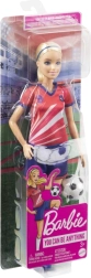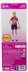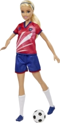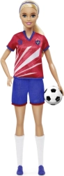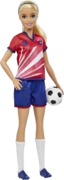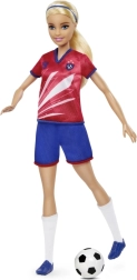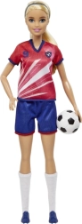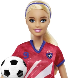 A Barbie focistalány aktív és ötletes játékra ösztönzi a gyerekeket. Hosszú, szőke haja copfba fogva, piros, fehér csíkos, 9-es számú mez, csapatjelvény, kék rövidnadrág, focicipő és magas fehér zokni. A mellékelt labdával készen áll az edzésre és a nagy meccsre is.