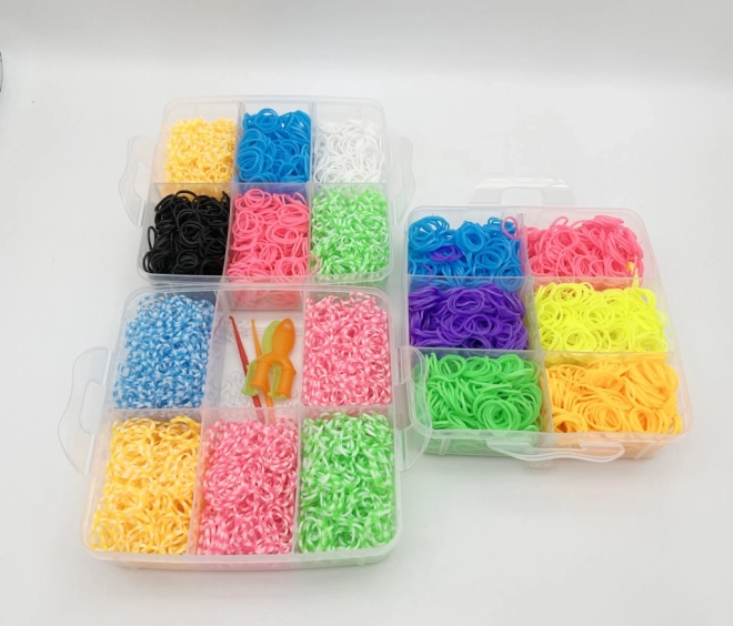 - 3000 db színes gumi szalag – széles színpaletta végtelen kombinációkhoz és mintákhoz.