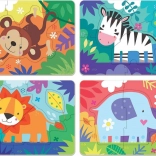 A készlet négy külön puzzle-t tartalmaz állatmotívumokkal – majom, zebra, oroszlán és elefánt. Amellett, hogy a gyerekek teljes képeket raknak össze, az egyes állatokat is külön-külön összerakhatják. A kész puzzle méretei kb. 24 x 16 cm.
