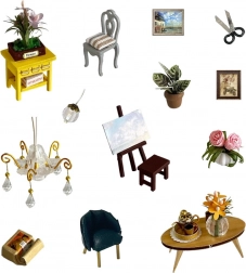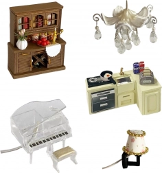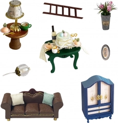 A csomag része miniatűr bútorok és dekorációk sora, amelyeket könnyedén összeállíthat és elrendezhet. Minden részlet a kész modell élethű megjelenését hangsúlyozza.