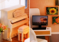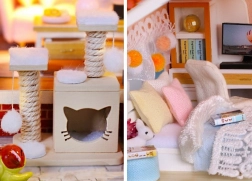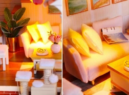 A modell fából, papírból és textilből készült, így valósághű és minőségi hatást kelt. A belsőt miniatűr bútorok és dekorációk díszítik, amelyek kiemelik a kis otthon hangulatát. A LED fények (2× AAA, nem tartozék) életre keltik a jelenetet, és este kellemes hangulatot teremtenek.