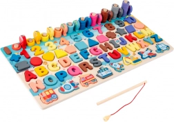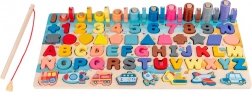 A tábla része egy mágneses bot, amely lehetővé teszi a gyerekeknek, hogy kipróbálják a halászás játékot különböző darabokkal.