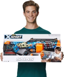 Lépj be a játékélmény világába az X-Shot Skins Blaster Game Over-rel, amely a Skins sorozat legnagyobb és leghatékonyabb blastere a Zuru Timestől. 14 habnyilat befogadó automatikusan forgó tárának köszönhetően precíz lövést nyújt akár 27 méteres távolságra is. A blaster taktikai fogantyúval és sínnel van felszerelve, amely további kiegészítők hozzáadását teszi lehetővé.