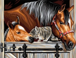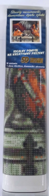 A gyémántfestés kreatív szórakozás mindenkinek, amely órákon át tartó, kellemes kikapcsolódást nyújt. Az applikáló toll segítségével apró „gyémánt” kövecskéket ragaszt a vászon kijelölt pontjaira, és fokozatosan csillogó képet hoz létre lovak és macska motívummal. Nincs szükség művészi készségekre – elég követni a szimbólumok legendáját.